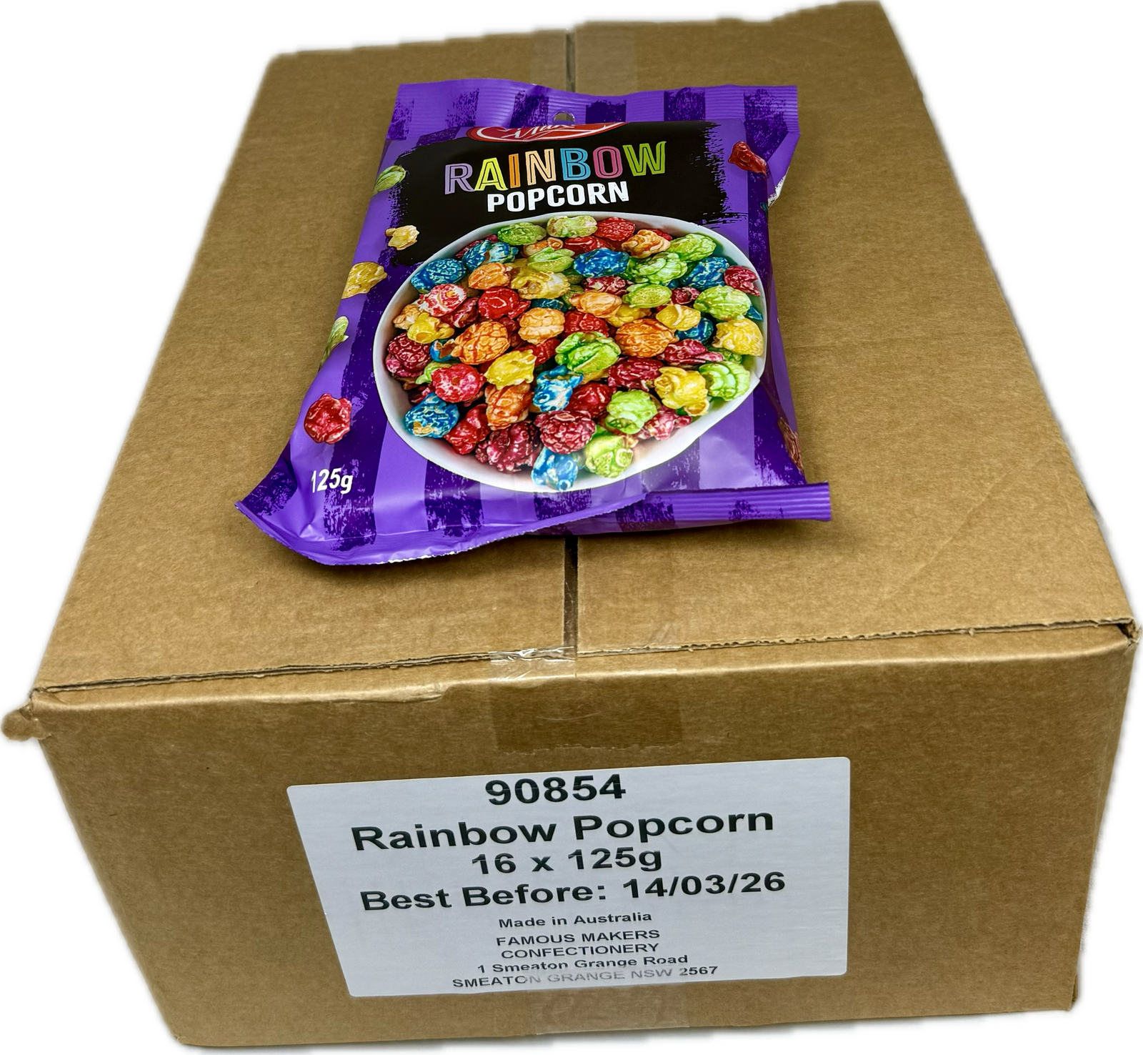 The Lolly Shop offers bulk lollies online wholesale from their warehouse in Australia. Our Famous Makers Rainbow Popcorn 125g bags – Famous Makers – Box of 16 is a well loved favorite in Popcorn, Caramel, bags, mixed flavor popcorn, rainbow popcorn.