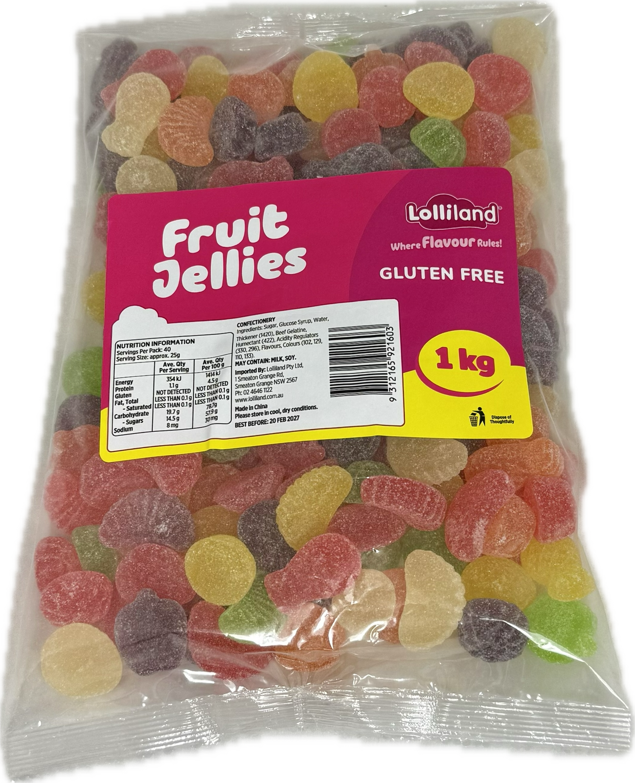 The Lolly Shop offers bulk lollies online wholesale from their warehouse in Australia. Our Fruit Jellies – Gummy 1kg Gluten Free  is a well loved favorite in chewy snacks, non-chocolate candy, sugar candy, colorful sweets, fruity gummies, candy for loot bags, school snack gummy, fruit bites, jelly snacks, 1kg candy pack.